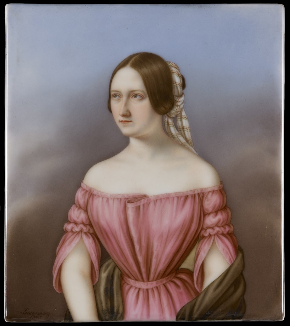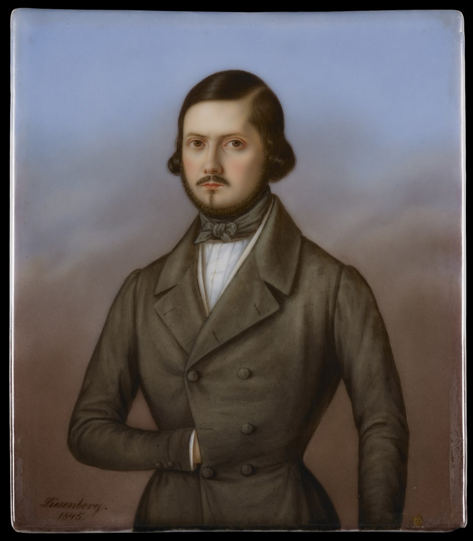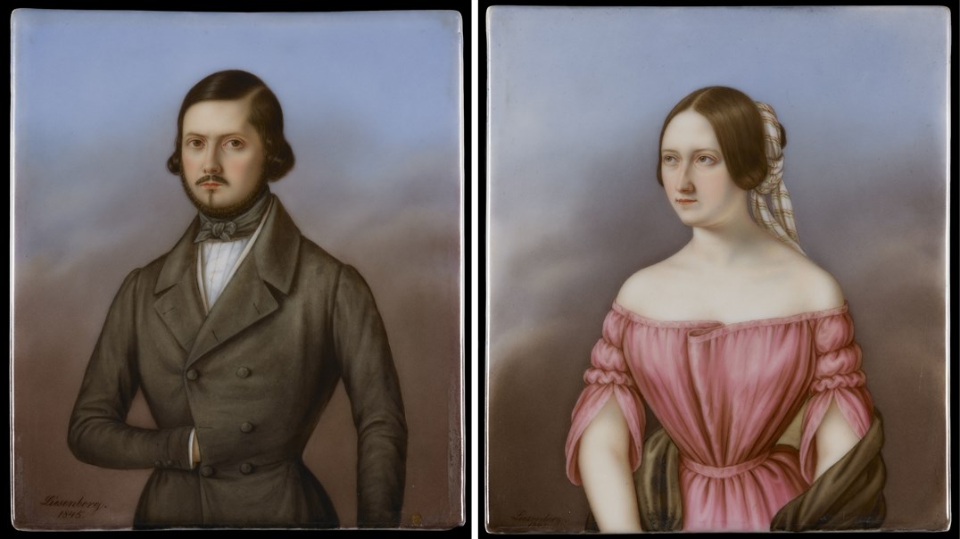 19th-century German master "Portrait of a Gentleman in a green jacket" and "Portrait of a Lady in a pink dress" a pair of oils on porcelain (cm 15,5x13) Signed and dated Liesenberg 1845 bottom left. Framed (defects)