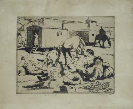 Francesco Chiappelli (Pistoia, 1890 - 1947) Il bivacco degli uomini grassi Acquaforte, mm. 240x290 (lastra), mm. 420x355 (foglio, es. p.d.a. Titolo in basso a sinistra, firma in basso a destra e dedica in data 30.3.33. In lastra, in basso a sinistra: "Sguerguenza".