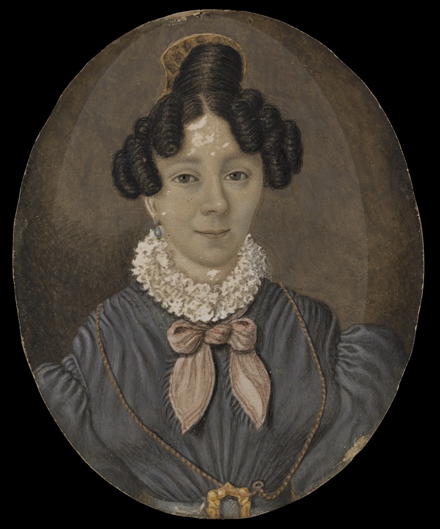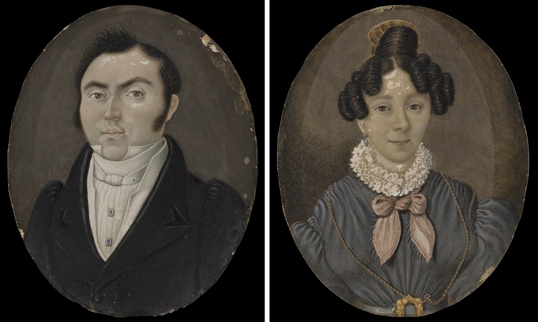 School of the 19th century "Gentleman and Lady" pair of miniatures, watercolour on paper (cm 10.5x6.5) Framed (defects)