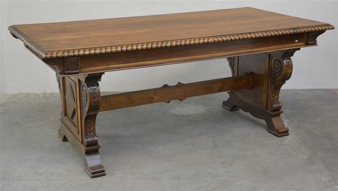 Tavolo in noce intagliato con gambe sagomate unite da traversa (cm 200x80x100) (lievi difetti)