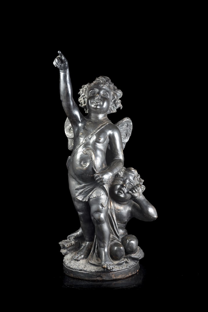 Firma indecifrata, fine secolo XIX "Amorini" gruppo scultoreo in terracotta patinata a finto bronzo (h. cm 68) Firmato al retro (lievi difetti)