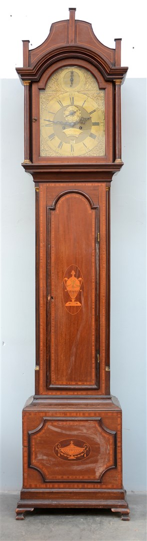 E. HANDSCOMB WOBURN Orologio a cassa lunga in legno con cimasa, quadrante...