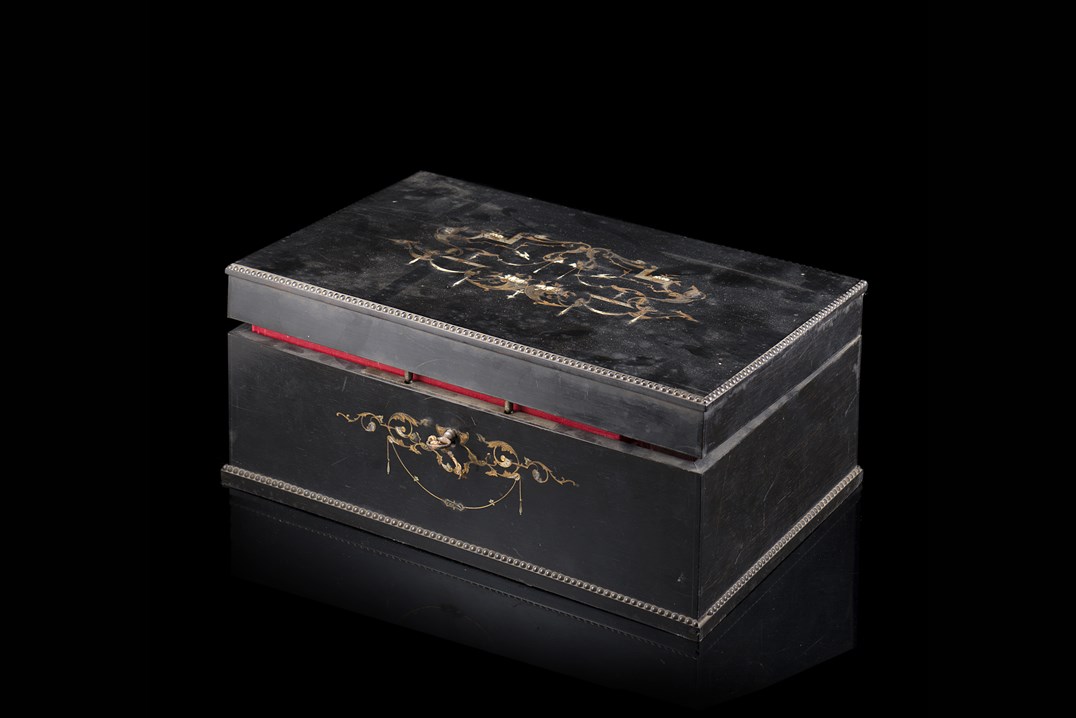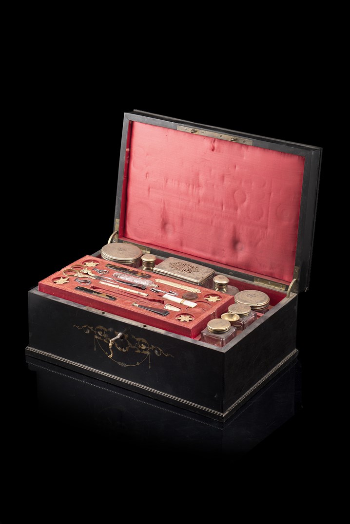 Necessaire da cucito in argento, vetro e tartaruga in custodia in legno ebanizzato intarsiato in madreperla e ottone. Punzoni francesi, secolo XIX (cm 36x15x23) (difetti e mancanze)