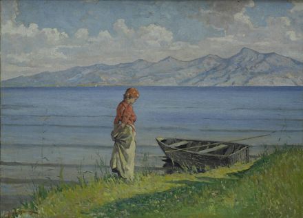 Angiolo Tommasi (Livorno, 1858 - Torre del Lago, 1923) Contadina sul Lago di Massaciuccoli Olio su tela, cm. 65x89 Firma in basso a sinistra. Bibliografia: "Ottocento/Catalogo dell'Arte Italiana dell'Ottocento", n. 35, Milano, 2006, tav. a colori tra pp. 480-481.