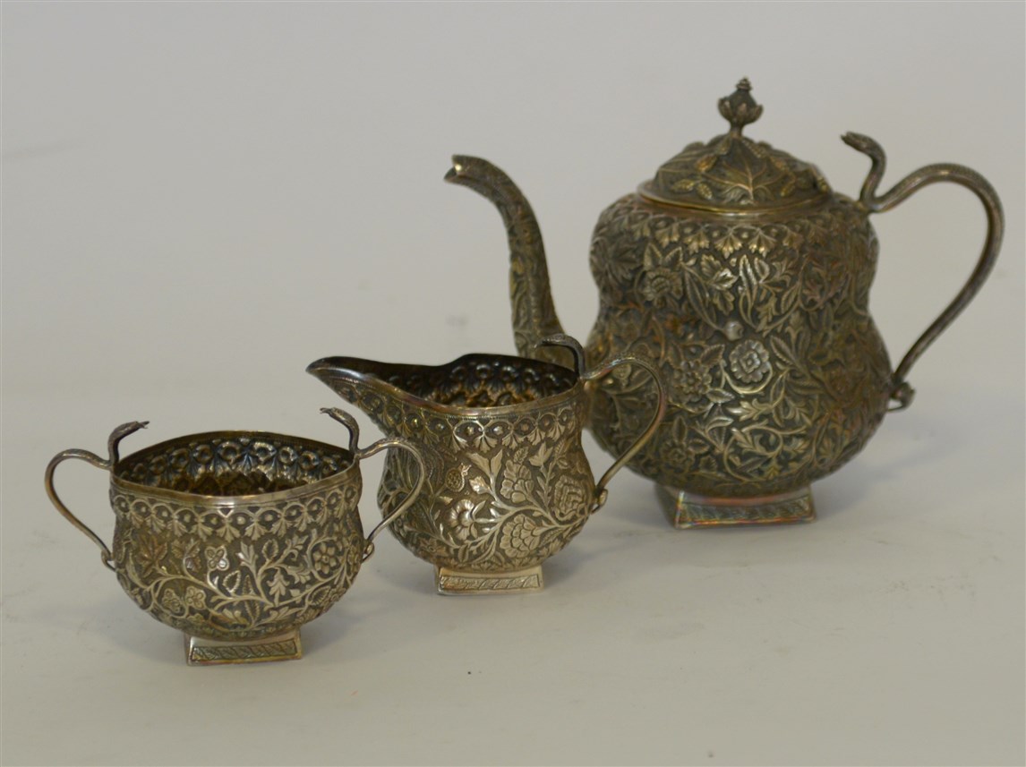 Teiera, lattiera e zuccheriera in argento cesellato a motivi vegetali, manici...