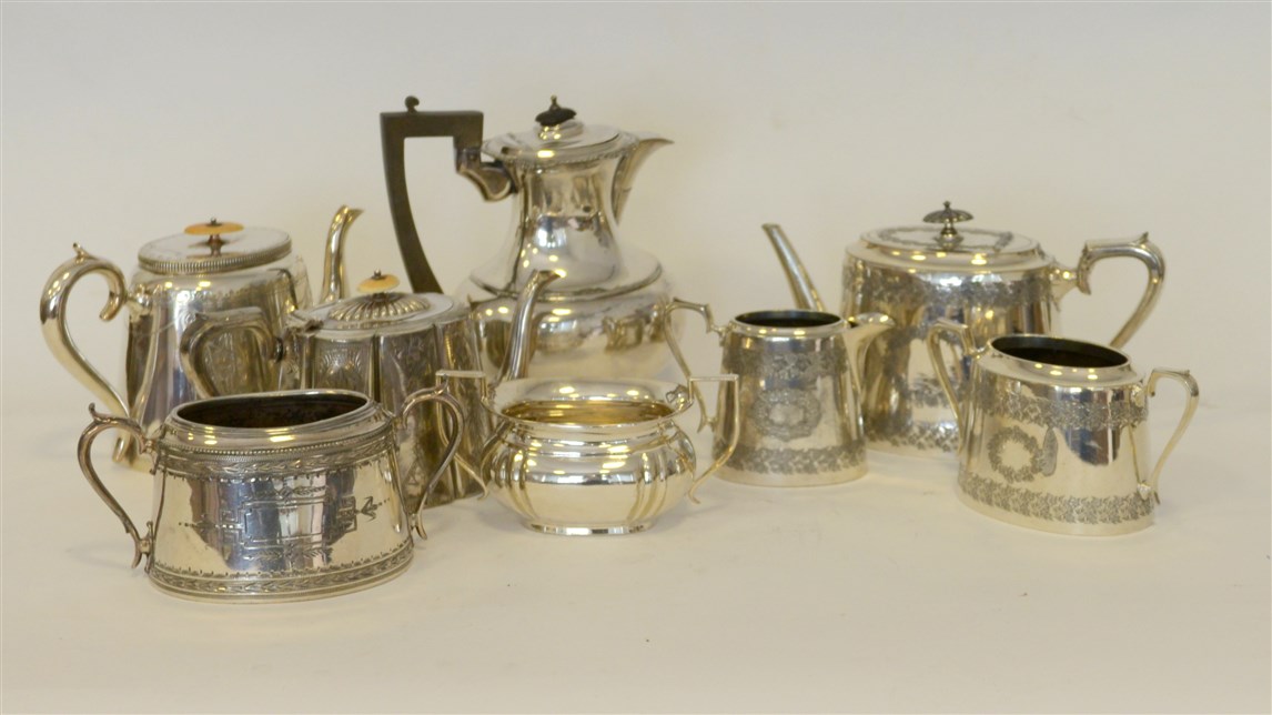 Lotto composto da un set di tre pezzi (teiera, lattiera e zuccheriera) in Sheffield cesellato a motivi floreali uniti a tre teiere e due zuccheriere in metallo argentato e peltro (difetti)