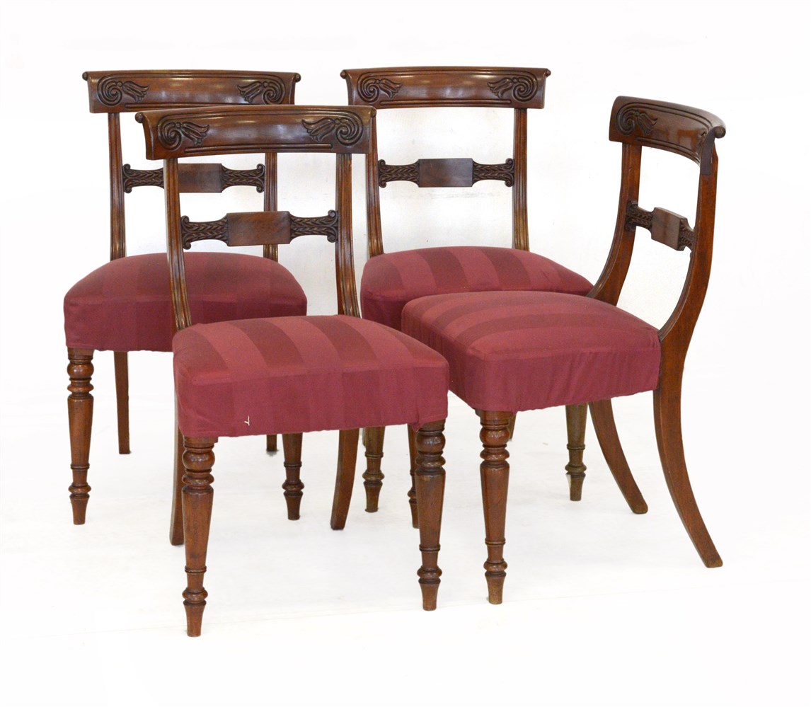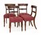 Gruppo di quattro sedie in mogano con schienali a giorno e gambe anteriori tornite, seduta rivestita in tessuto bordeaux. Inghilterra, secolo XIX (lievi difetti). Si unisce l'expertise della galleria Gracis di Milano