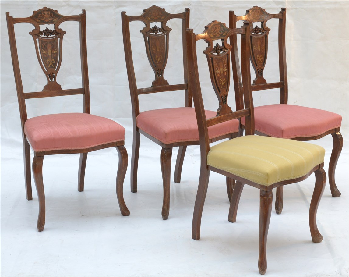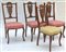 Gruppo di quattro sedie in mogano con schienale a giorno, cartella e cimasa intarsiate a fregi, foglie e motivo a nastro. Gambe anteriori sagomate e seduta rivestita in stoffa color salmone (difetti)