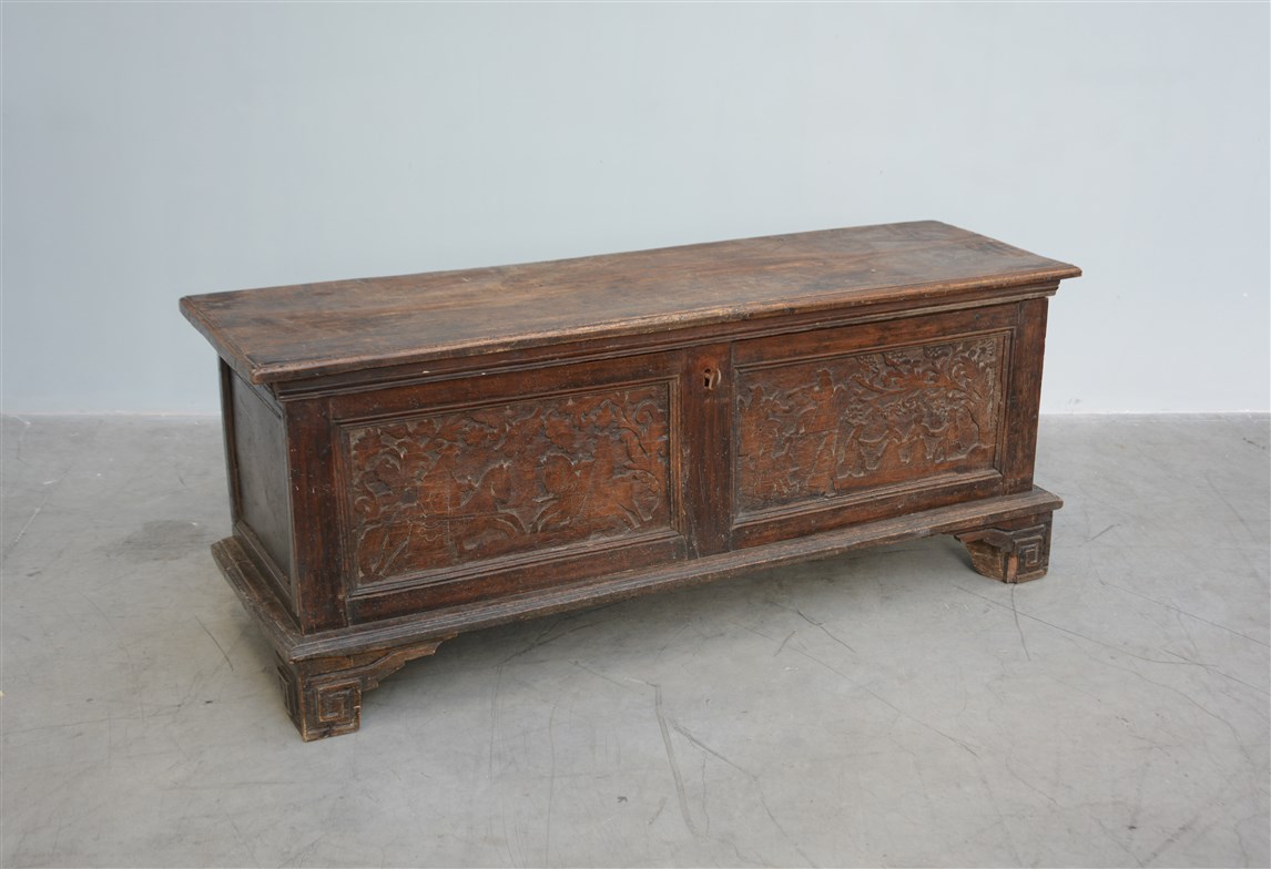 Cassapanca in noce con fronte intagliato a scene di vita. Francia, secolo XVIII (cm 153x61x47) (difetti)
