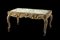 Tavolino da salotto in legno scolpito e dorato, fascia decorata a motivi stilizzati e intagliata a valve di conchiglia e volute. Gambe mosse a foglie d'alloro e fiori, terminanti a ricciolo. Piano decorato con stoffa a fiori (cm 98x42,5x56,5) (difetti)