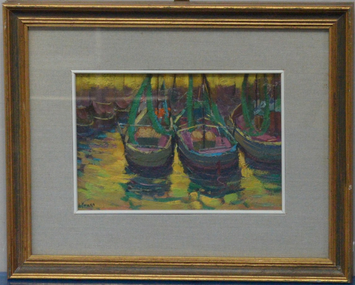 Ettore Frana "Barche nel porto" olio su cartone (cm 16x23) firmato in basso a sinistra, in cornice (difetti)