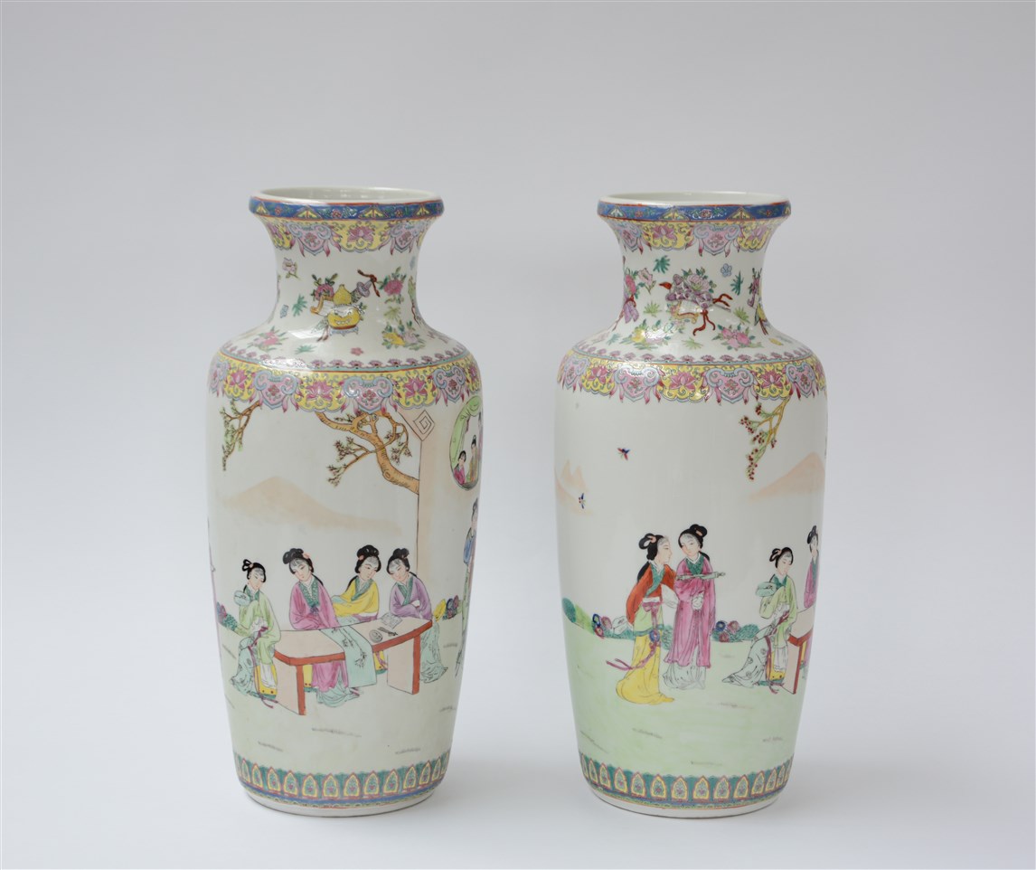 Coppia di vasi in porcellana a smalti policromi nei toni del rosa decorati con dame in giardini e interni
