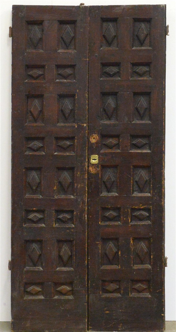 Antico portoncino doppio decorato a riquadri con all'interno pannelli romboidali. (cm 210x49 cad). (Difetti)