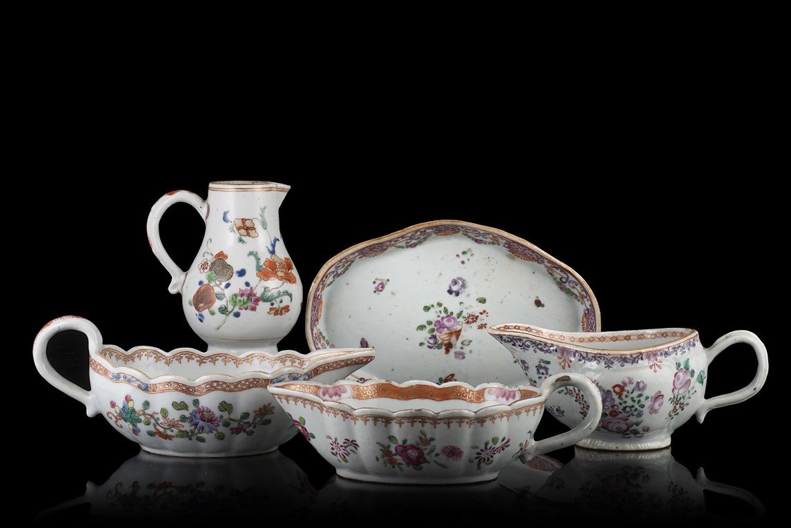 A group of Famille Rose porcelains, composed by two sauce boats, a small tray and a ewer