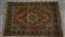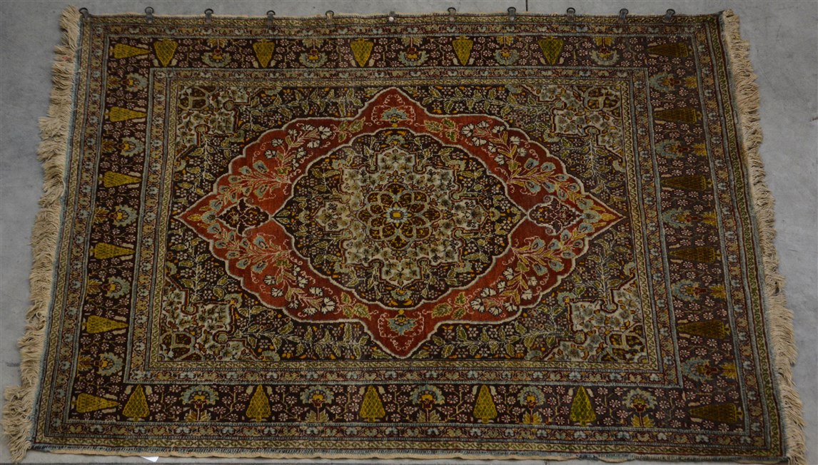 Tappeto Kaiseri, Anatolia inizio secolo XX. Decoro con medaglione con puntali marrone scuro e bianco su fondo rosso mattone. Bordura con cipressi e palme su fondo prugna (cm 170x125) (difetti)