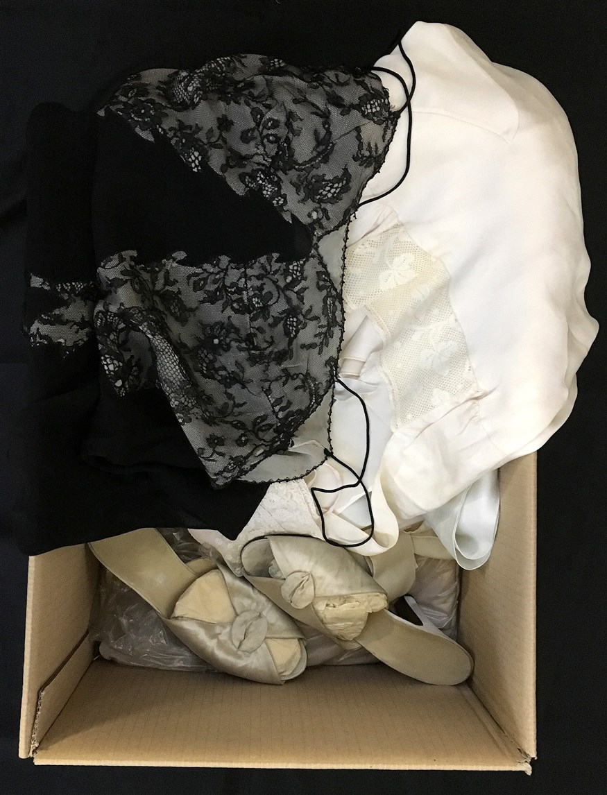Cartone di biancheria intima decorata con pizzi vari uniti ad un paio di pantofole con tacco in raso d'epoca (difetti)