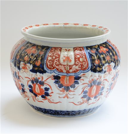 Vaso Imari in porcellana decorato a motivi floreali su fondo bianco. Secolo XIX (d. cm 25) (gravi difetti alla base e restauri)
