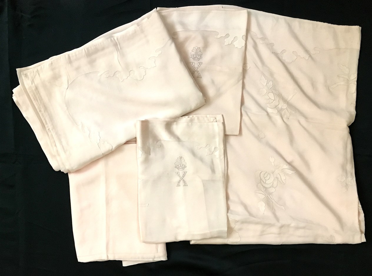 Completo per letto singolo in seta rosa, decorato con applicazioni floreali in tinta (lievi difetti)
