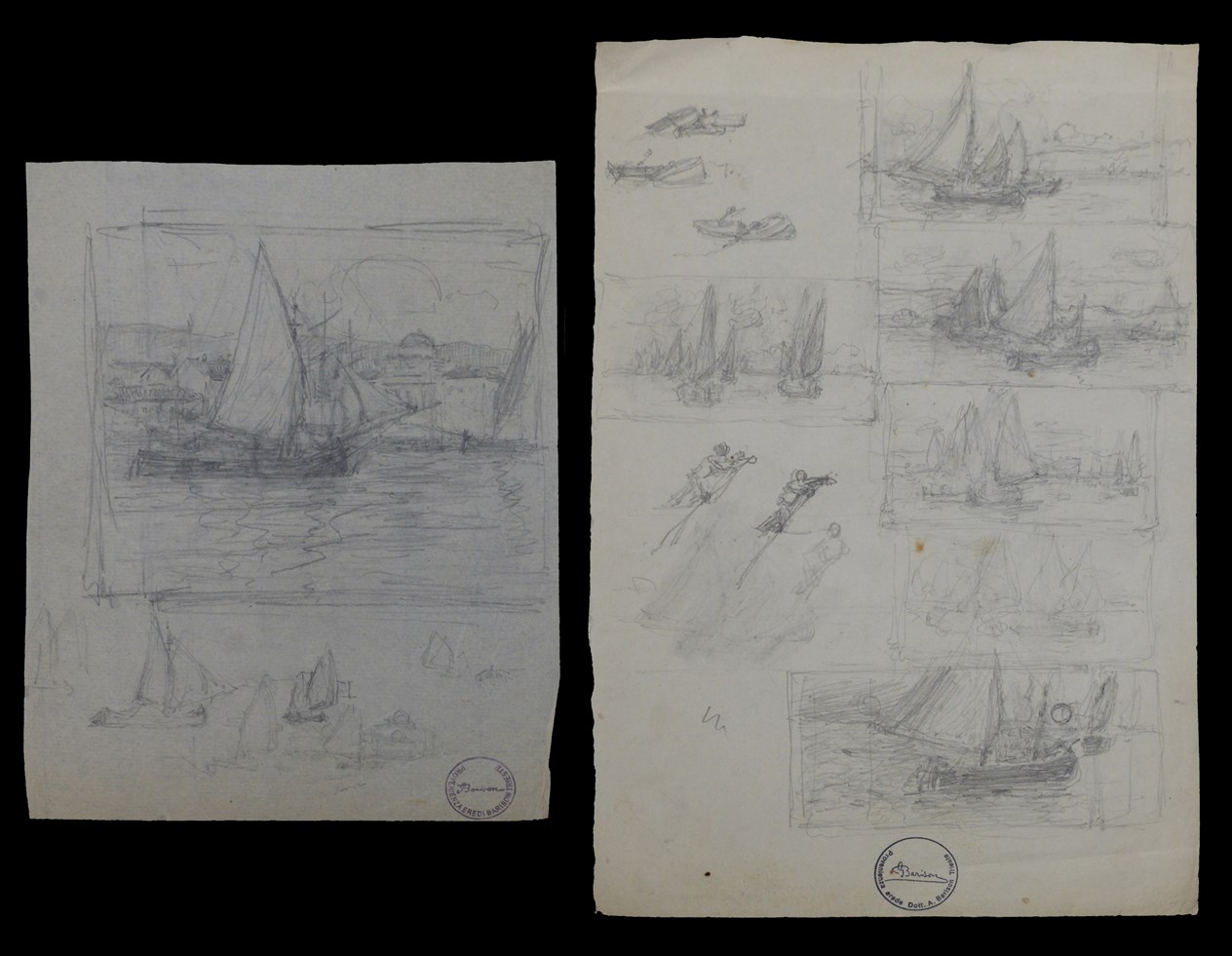"Studio di marine" e "Verso Palazzo Carciotti, Trieste" due disegni a matita su carta (cm 27x20 e 22x17) Timbri degli eredi Barison, Trieste (difetti)