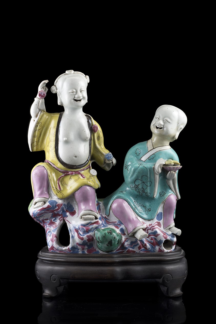A porcelain model of the laughing twins (hehe er xian), enamelled in yellow and turquoise enamels. China, Qianlong period (restorations)