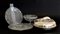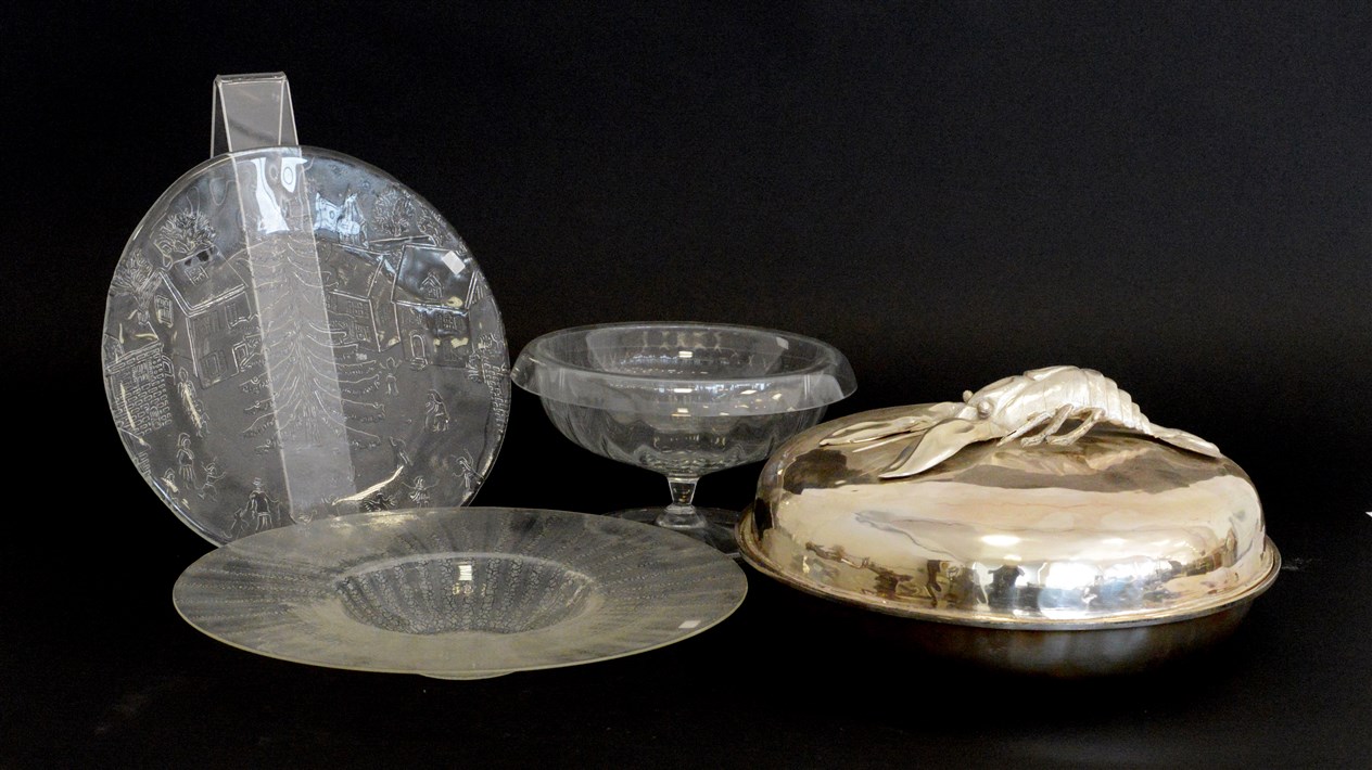 Lotto composto da due centrotavola tondi e un'alzatina portafrutta in vetro, ed un contenitore in metallo con presa del coperchio a forma di astice (difetti)