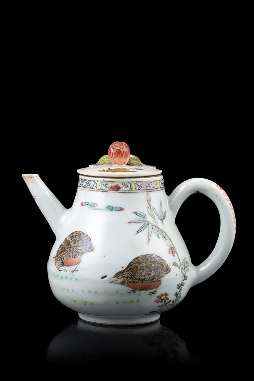 Teiera in porcellana Famiglia Rosa decorata con coppia di quaglie, coperchio...