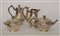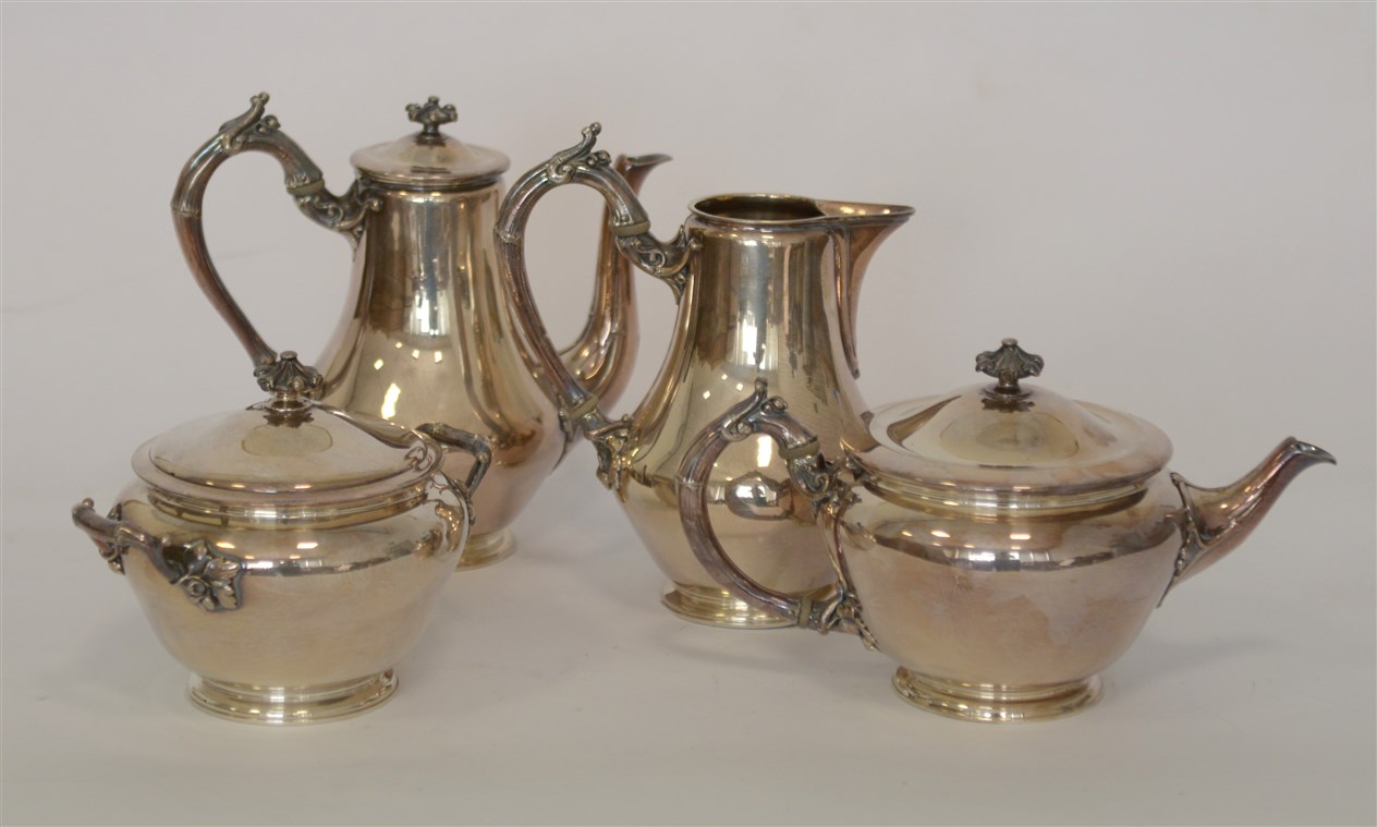 Caffettiera, teiera, lattiera e zuccheriera in metallo argentato a corpo liscio, manici sagomati, prese del coperchio a forma di fiore a tutto tondo.