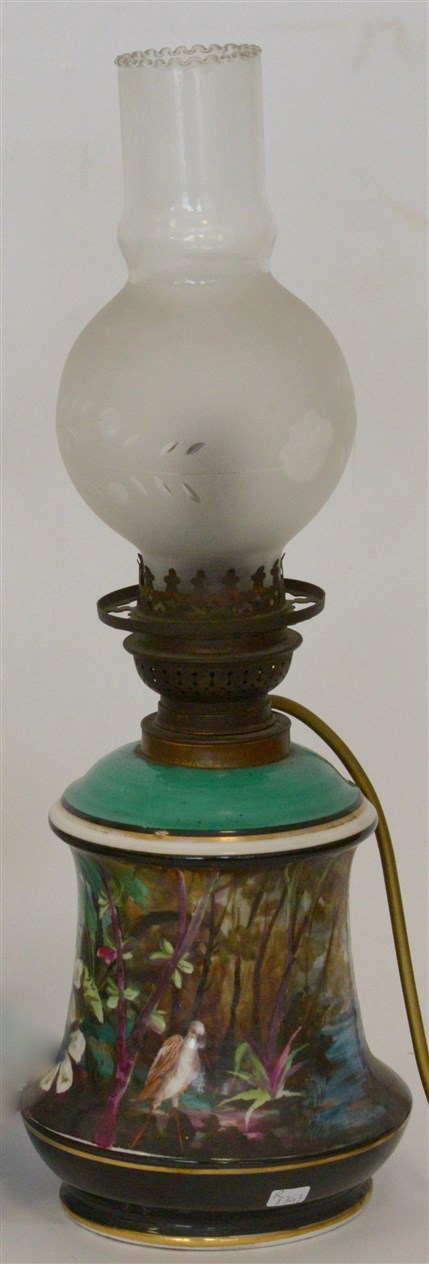 Lotto composto da una zuppiera con coperchio in ceramica decorata in policromia ed una lampada a petrolio in porcellana policroma e vetro, montata a luce elettrica (difetti)