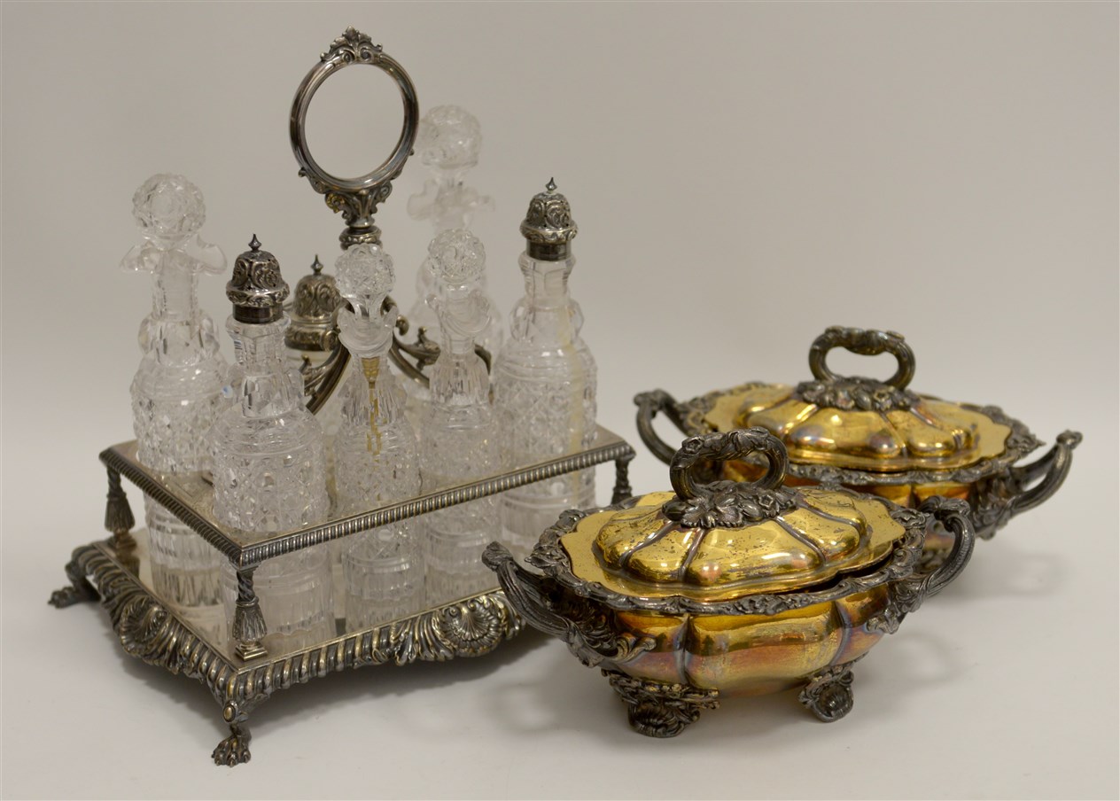 Lotto composto da un servizio da condimento e due zuppierine in metallo agentato, dorato e vetro (difetti)