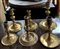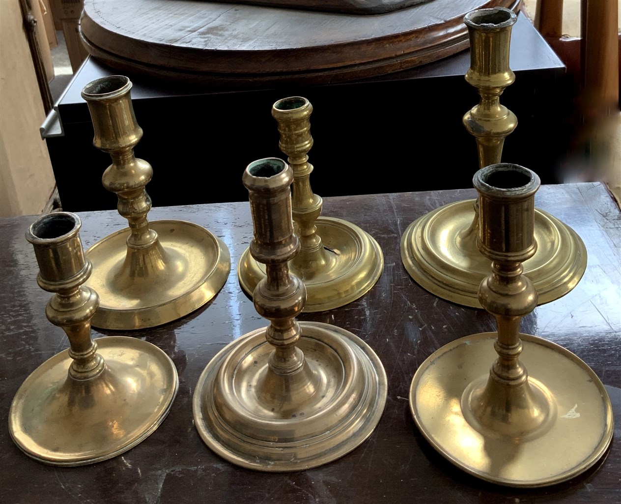Gruppo di sei candelieri in metallo con basi circolari di fatture differenti (h max cm 18) (difetti)