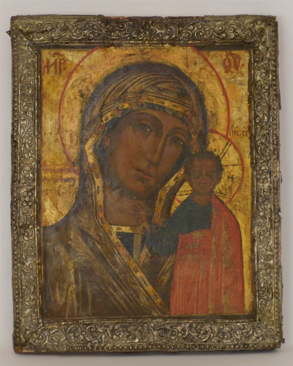 Arte Russa del secolo XIX "Madonna con Bambino" icona su tavola (cm 32x26) con riza in argento (difetti e mancanze)