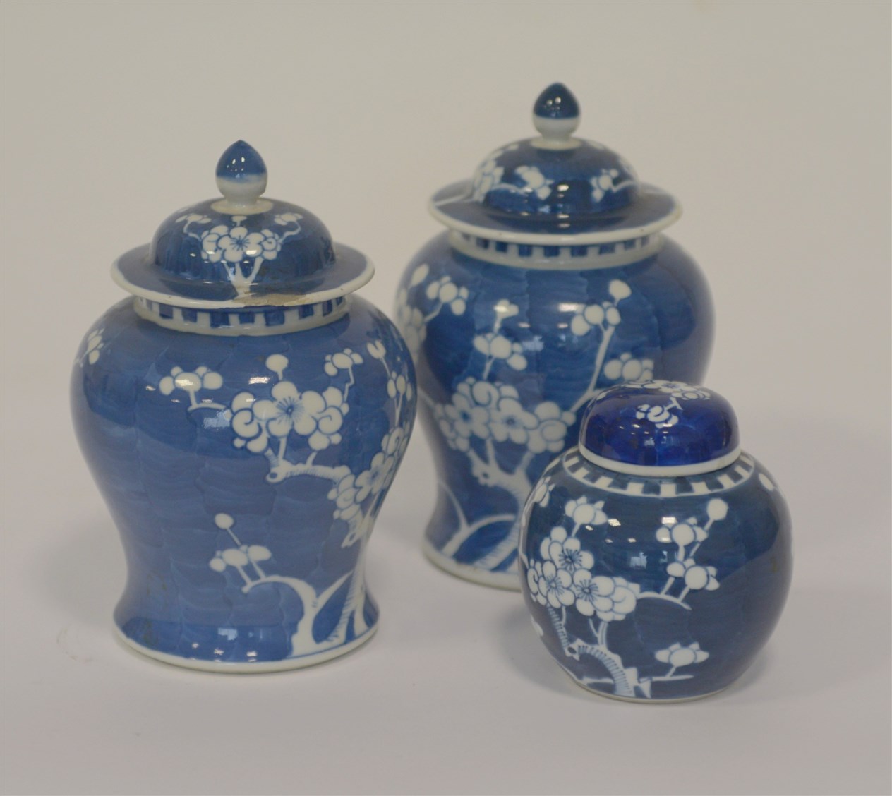 Tre vasi in porcellana bianca e blu decorati con motivi floreali. Cina, sec. XX (misure diverse) (difetti)