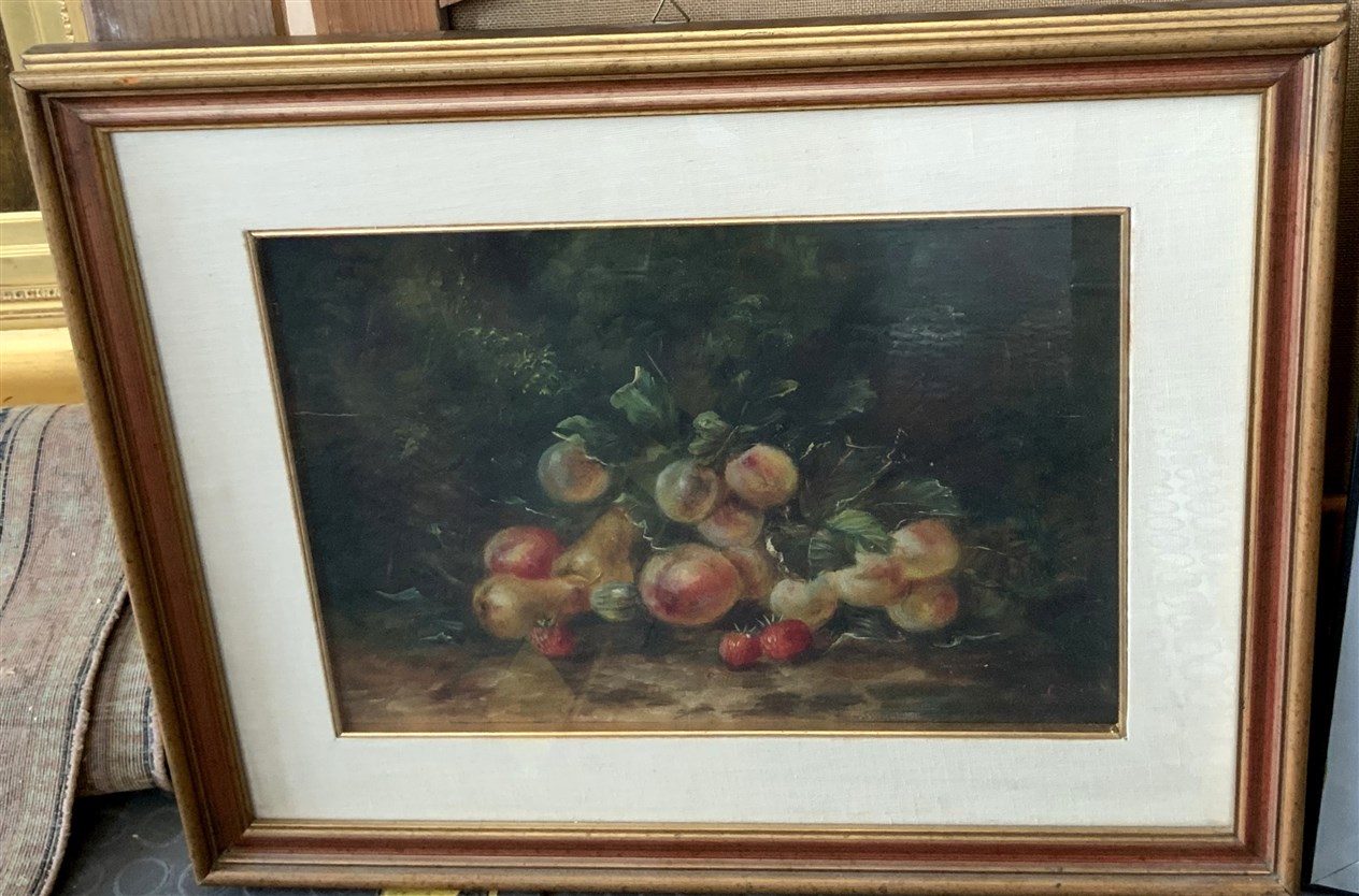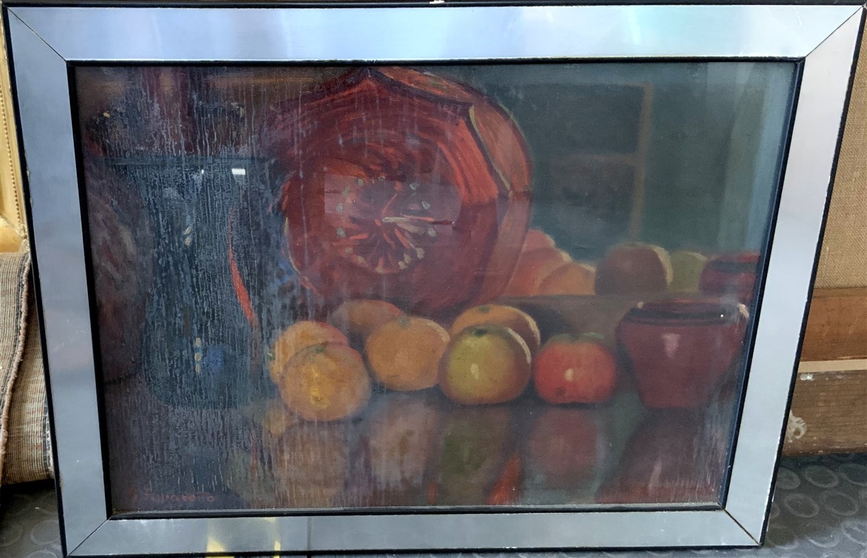 Lot 608 | Lotto di due dipinti ad olio raffiguranti nature morte con frutta, autori e...