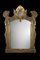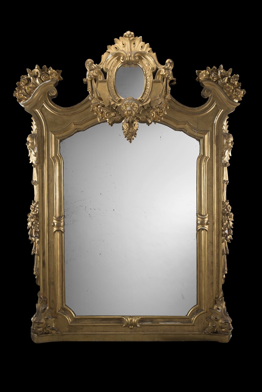 Caminiera in legno intagliato e dorato con cimasa a specchio scolpita a mazzi fioriti e testa leonina che sorregge un festone. Montanti decorati a volti fantastici e mazzi fioriti. Secolo XIX (cm 200x125) (difetti)
