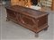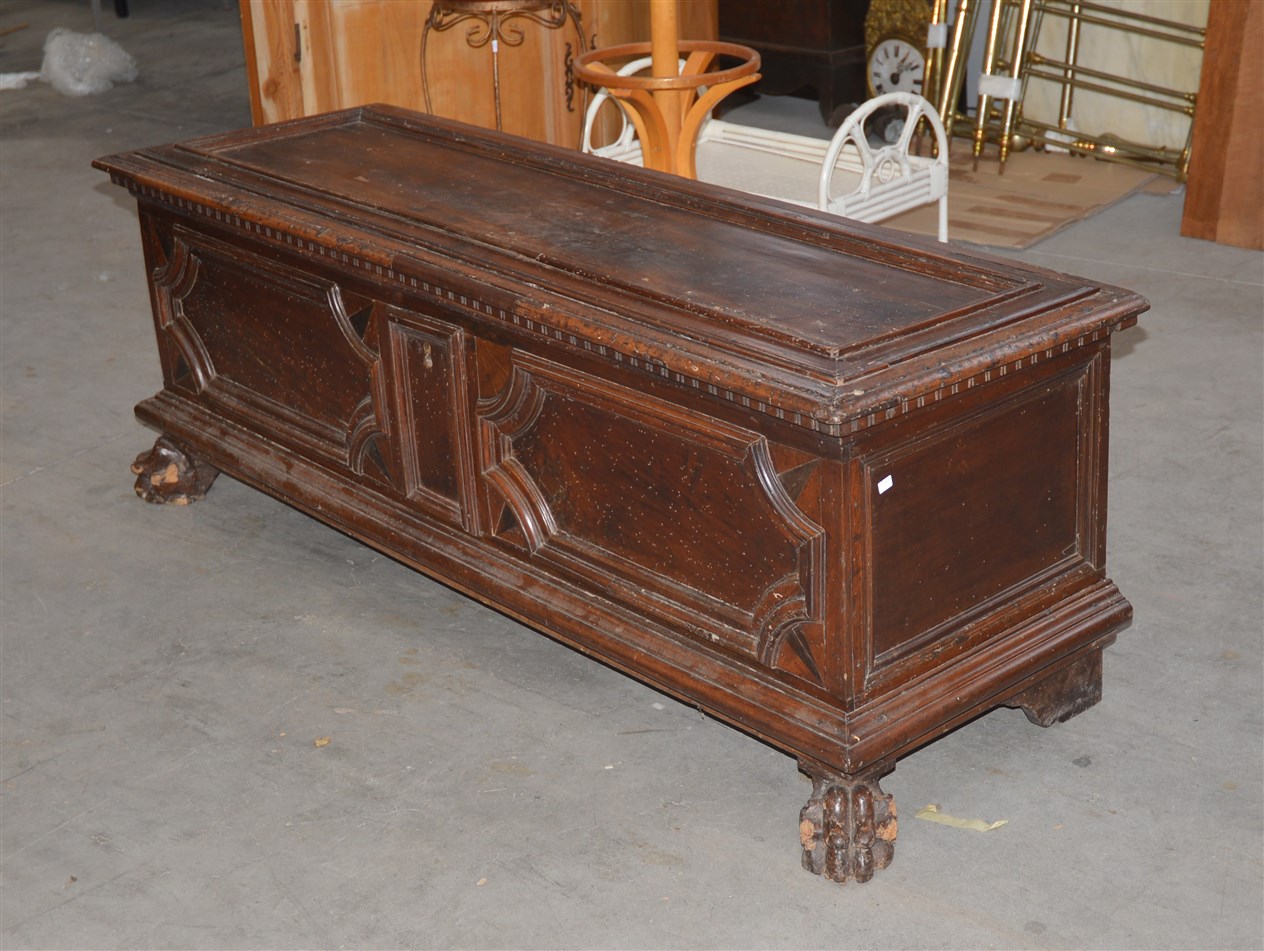 Cassapanca in noce con fronte, fianchi e coperchio pannellati. Centro Italia secolo XVII (cm 166x60x57) (difetti)
