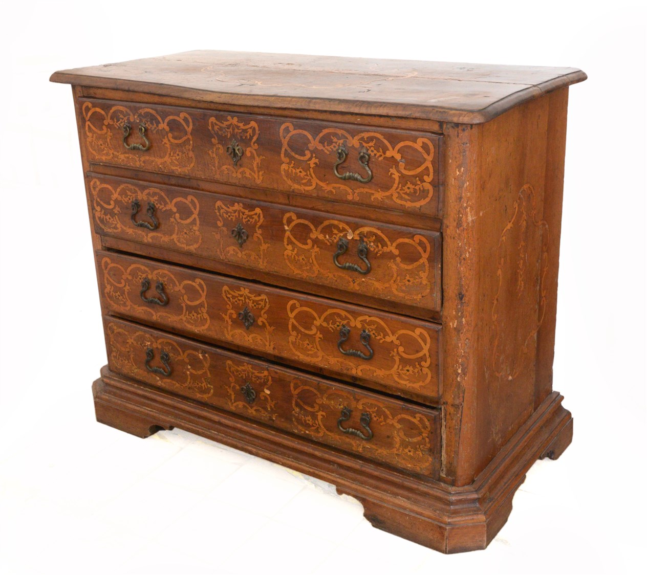 Comò a quattro cassetti intarsiato a motivi vegetali e fiori. Piedi a mensola. Piemonte sec. XVIII (cm 125x100x58)(difetti, restauri e mancanze)