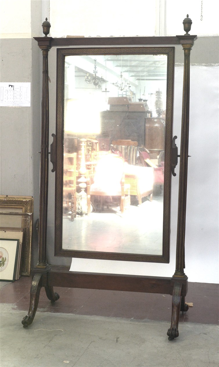 Psiche lastronata in mogano con specchiera basculante. Profili intarsiati in ottone a greche, montanti a colonna scanalata con capitelli e pinnacoli in bronzo tornito. Piedi ferini. Napoli, secolo XIX (cm 108x200) (difetti)