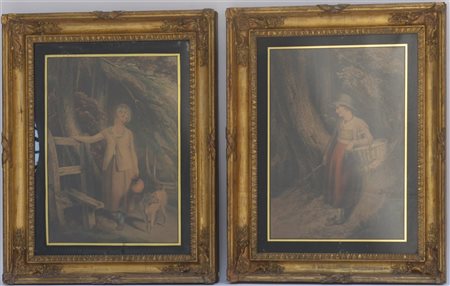 Coppia di incisioni inglesi a colori raffiguranti "una ragazza che torna dal mercato" e "una ragazza che va a prendere dell'acqua" (cm 50x35) Secolo XIX, in cornici (difetti)
