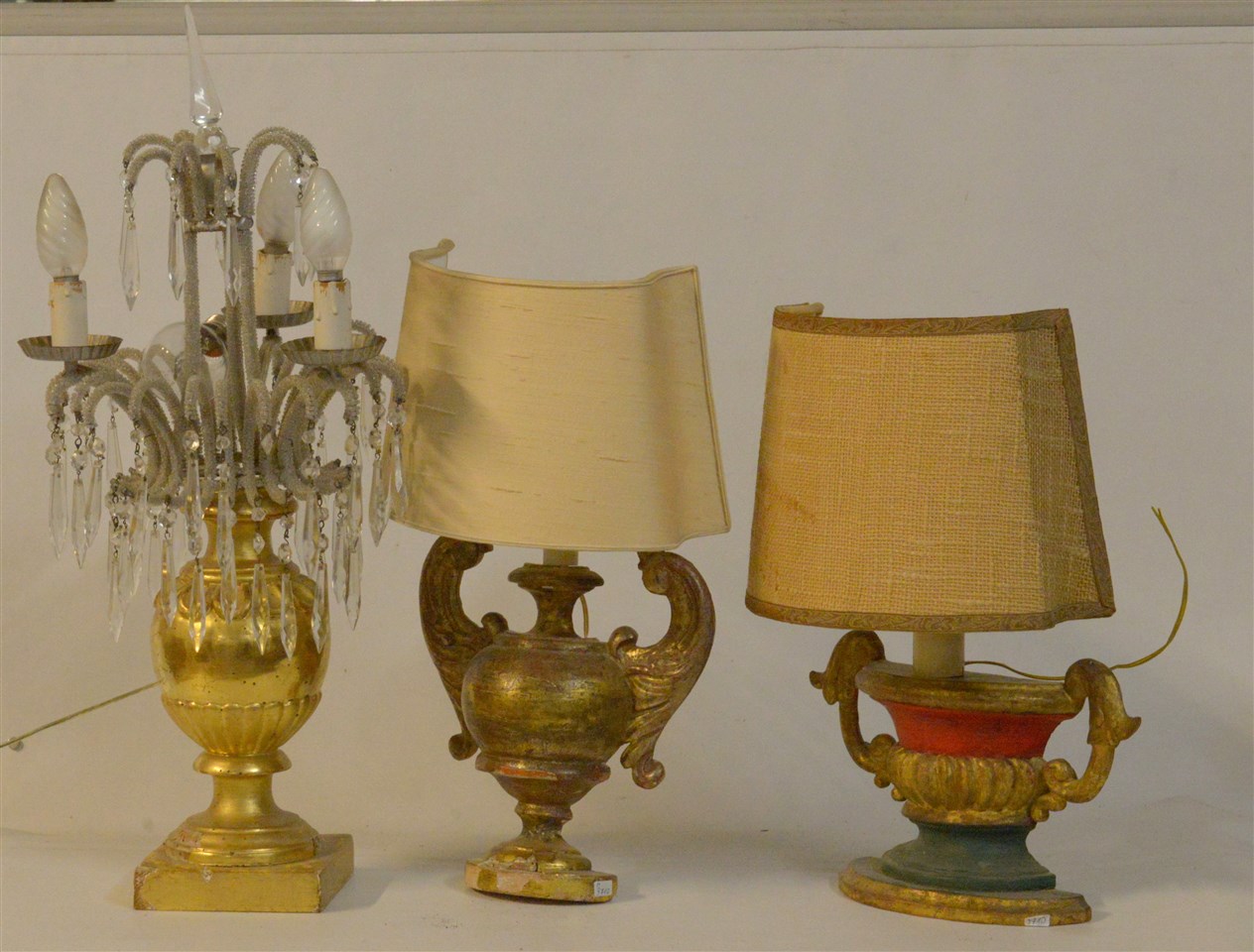 Lotto composto da una girandole e due lampade da tavolo ricavate da un portapalme del secolo XIX in legno intagliato, dorato e laccato (difetti e mancanze)