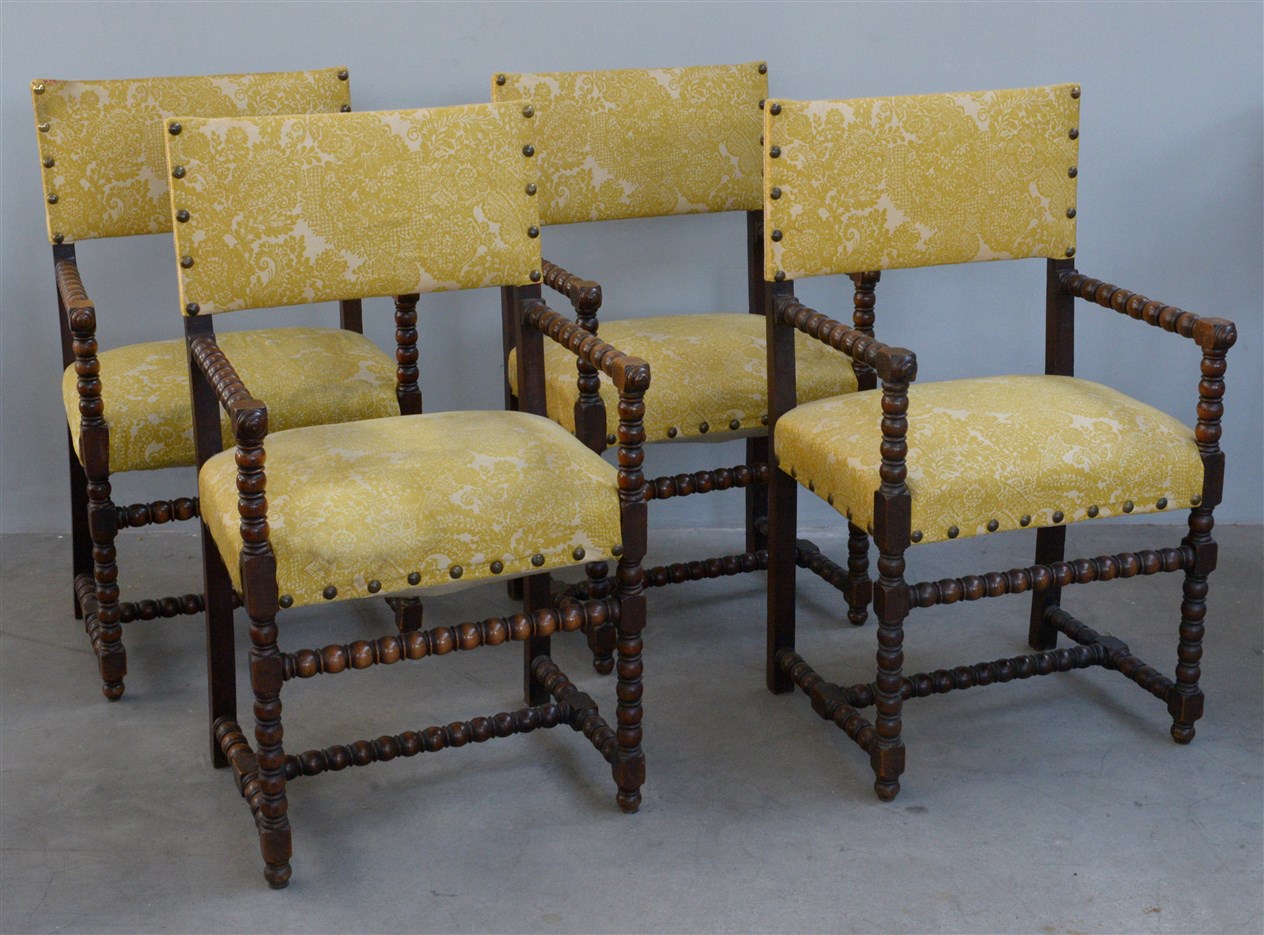 Gruppo di quattro poltrone in legno tornito con gambe riunite da traverse, sedute e spalliere rivestite in tessuto floreale giallo (difetti)