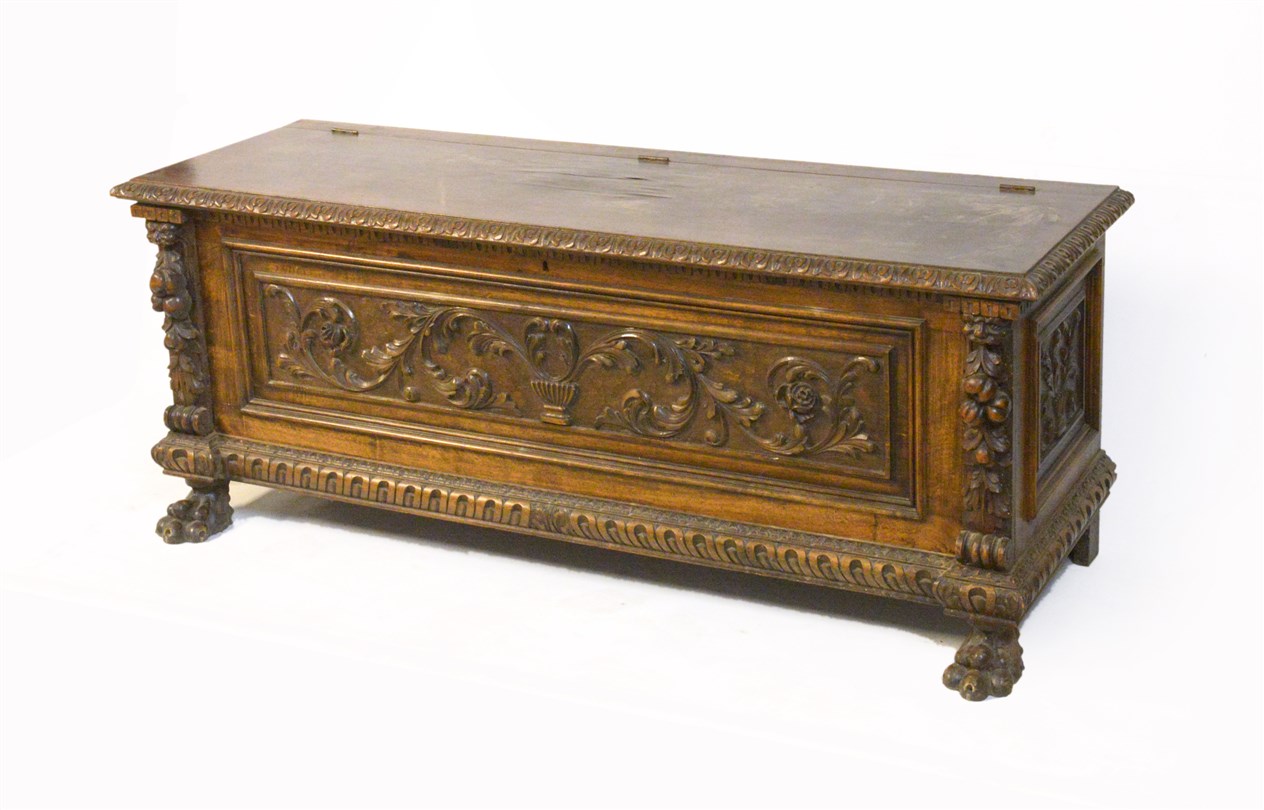 Lot 684 | Cassapanca in legno intagliato a motivi rinascimentali, montanti scolpiti a...