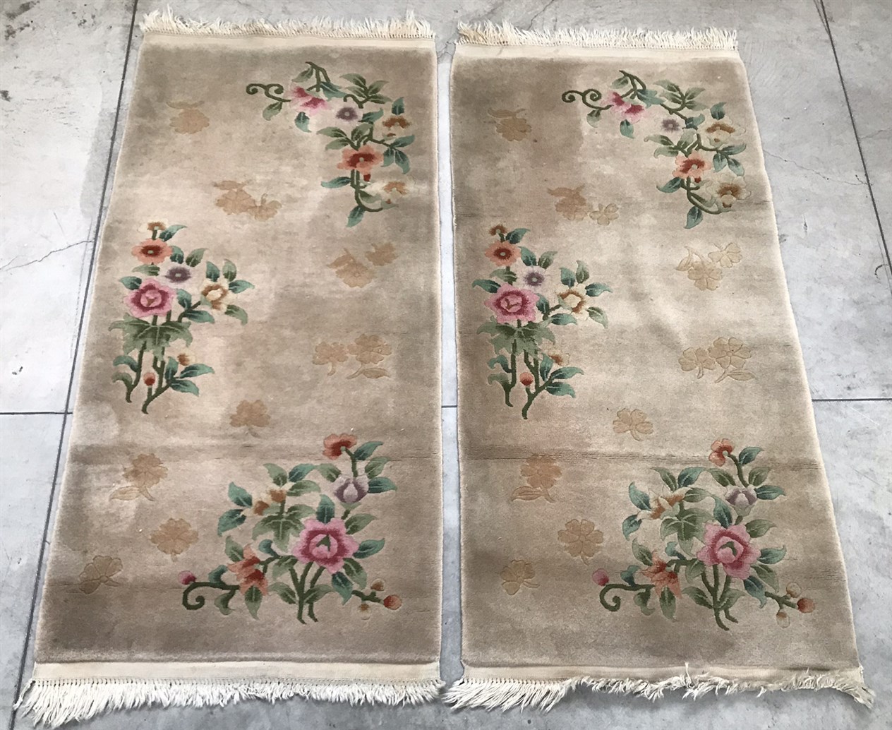 Coppia di scendiletto su fondo beige decorati in policromia a motivi floreali (difetti)