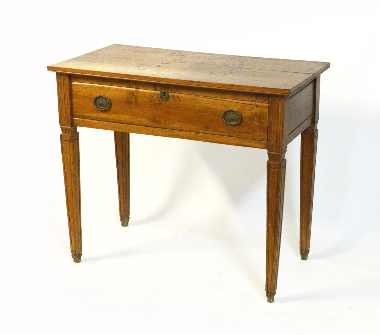 Tavolino ad un cassetto sottopiano, gambe rastremate. Inizio secolo XIX (cm 87x75x46) (difetti, restauri mancante delle chiavi)