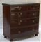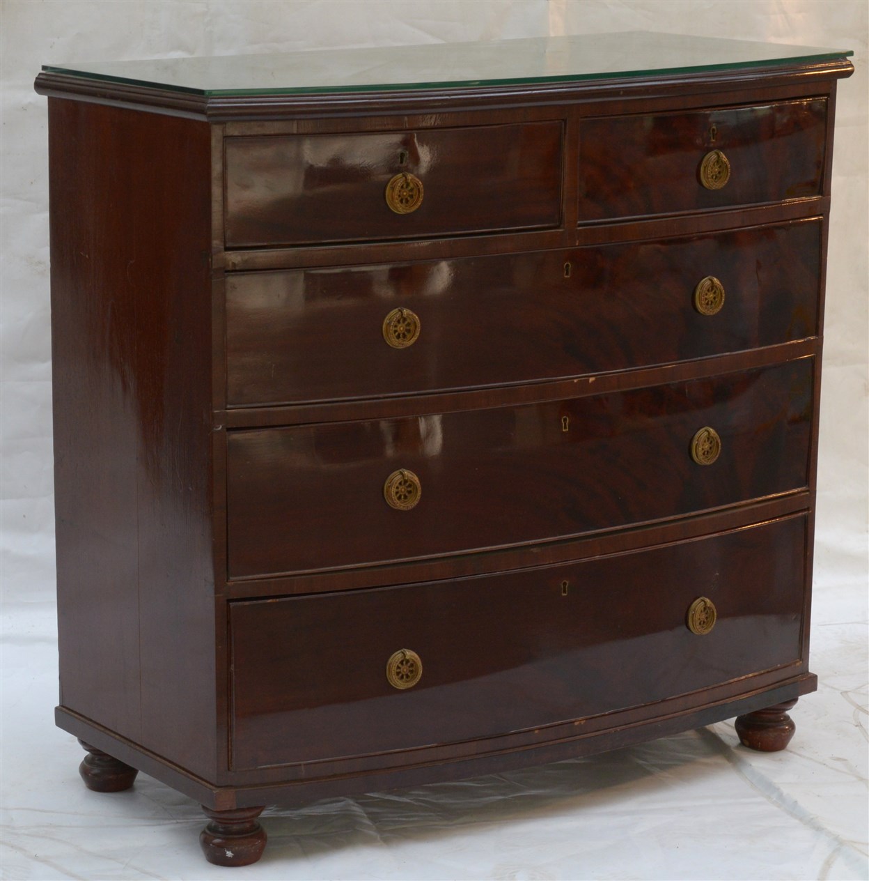 Comò "inglese" in mogano con fronte curvilineo a tre cassetti grandi e due più piccoli sottopiano in linea, maniglie in metallo dorato. Piedini a "cipolla" (cm 102x89x46) (difetti)