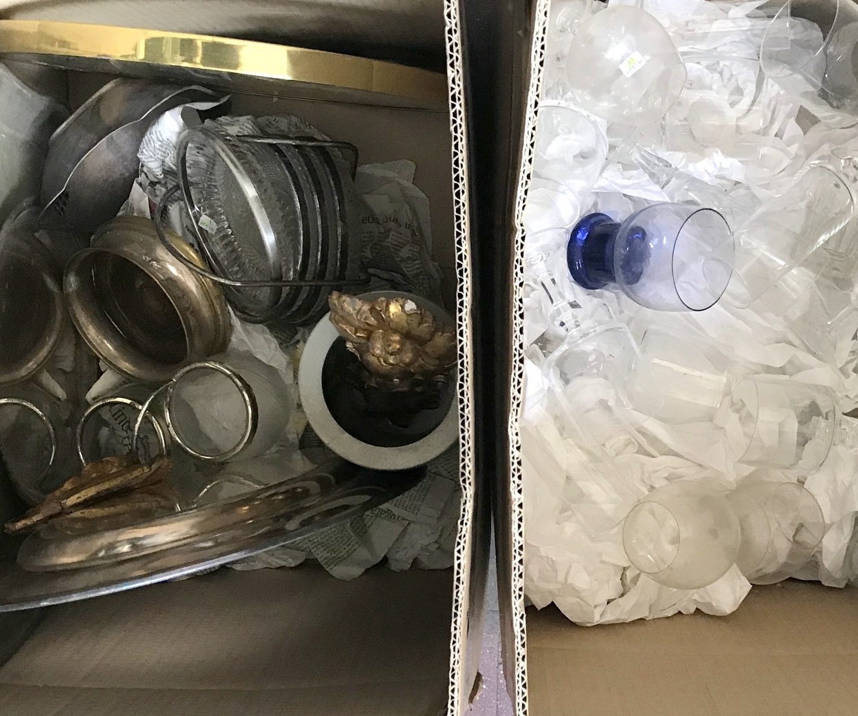 Due cartoni contenenti numerosi oggetti in vetro, metallo e legno (difetti)
