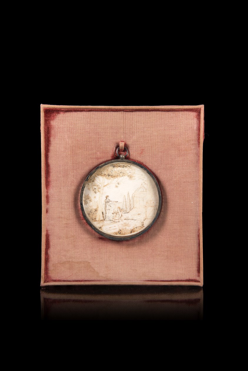 Maestro del secolo XIX "Paesaggio con scena classica" miniatura a grisaille su avorio (d. cm 6,5) Tracce di iscrizione in basso a sinistra (difetti)