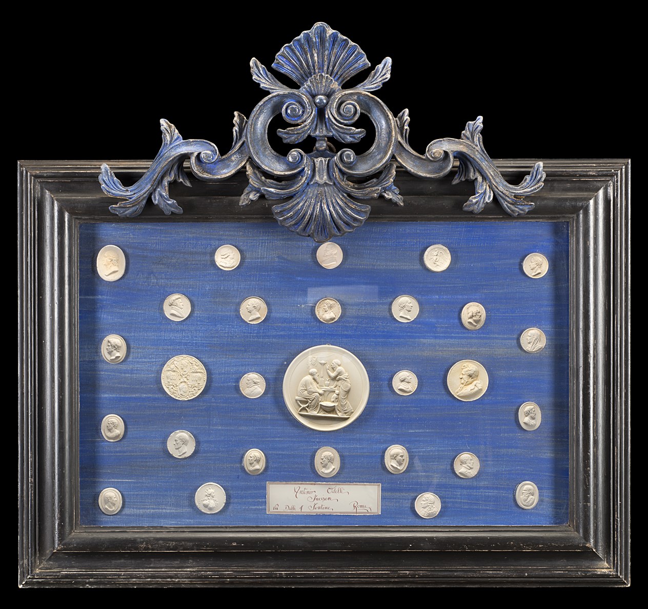 Antonio Odelli (Rome, 19th century) A group of twenty-eight gypsum medallions with case. Handwritten label "Antonio Odelli incisore, Via delle Quattro Fontane, Roma" (cm 92x100) (minor defects)