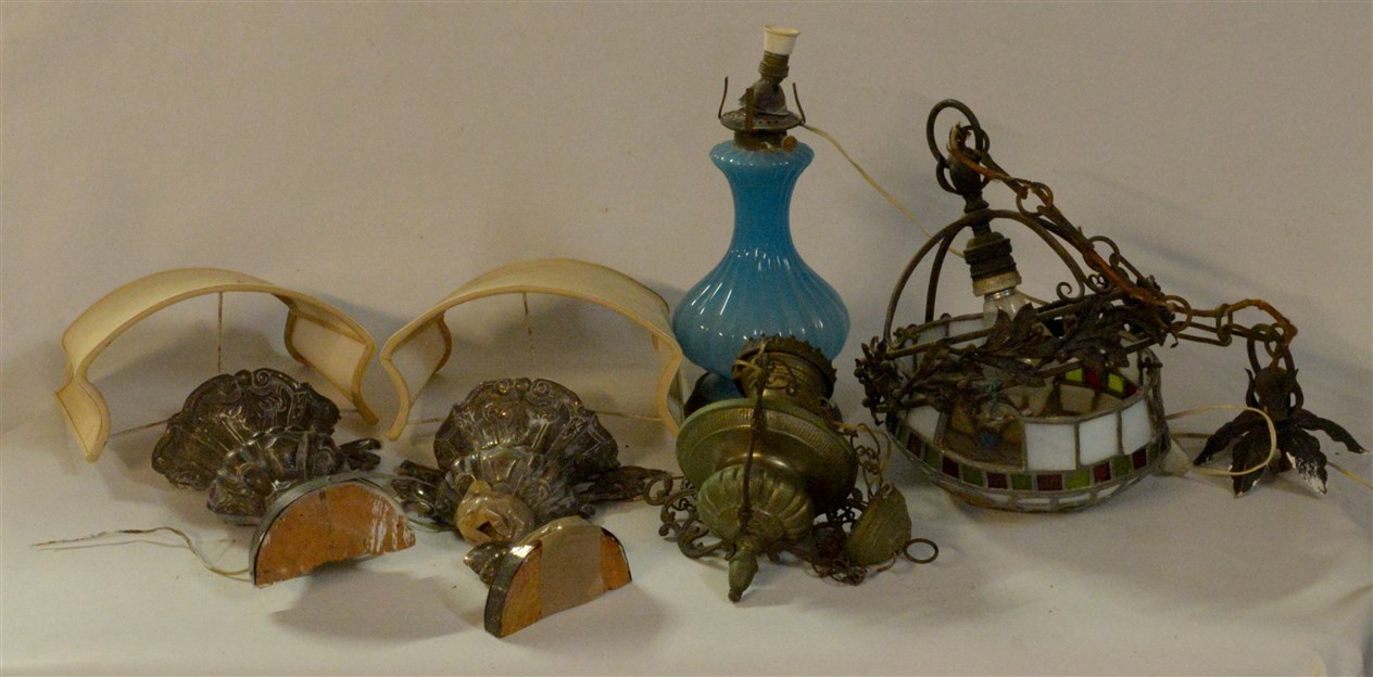 Lotto composto da due portapalme in rame argentato, una lampada in opaline, una piccola lampada votiva e un lampadarietto in metallo e vetro (gravi difetti e mancanze)