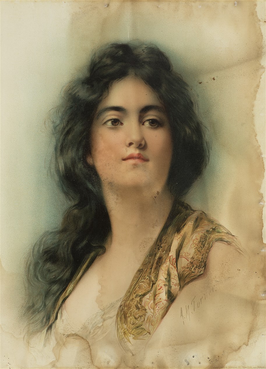 Stampa raffigurante gentildonna con ampia scollatura (cm 50x36,5) In cornice (difetti)