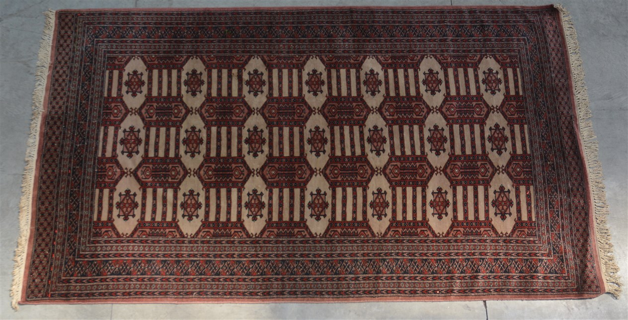 Tappeto Boukhara. Pakistan, secolo XX. Disegno geometrico su fondo bianco (cm 260x150) (lievi difetti)